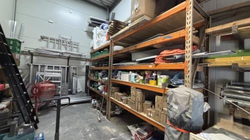 2 delen palletstelling met inhoud w.o. tegels, lijmen, isolatiemateriaal, zink, bevestigingsmaterialen etc. (m.u.v. genummerde kavels, autobank en eetkamerstoelen)