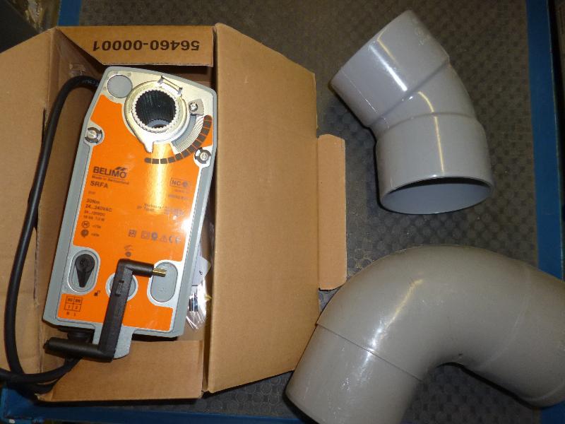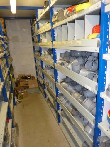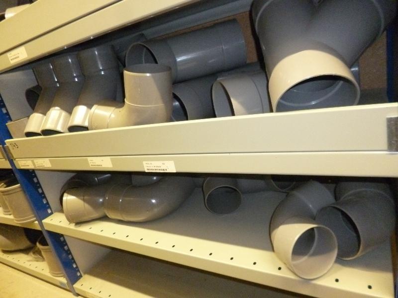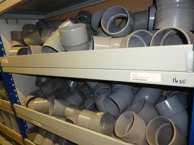 1 partij pvc fittingmateriaal, diam. 100, bochten, sifons, zadels, pijpbeugels, pvc beugels en ijzerbeugels