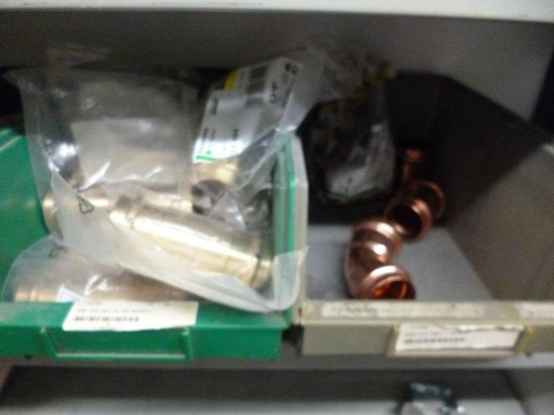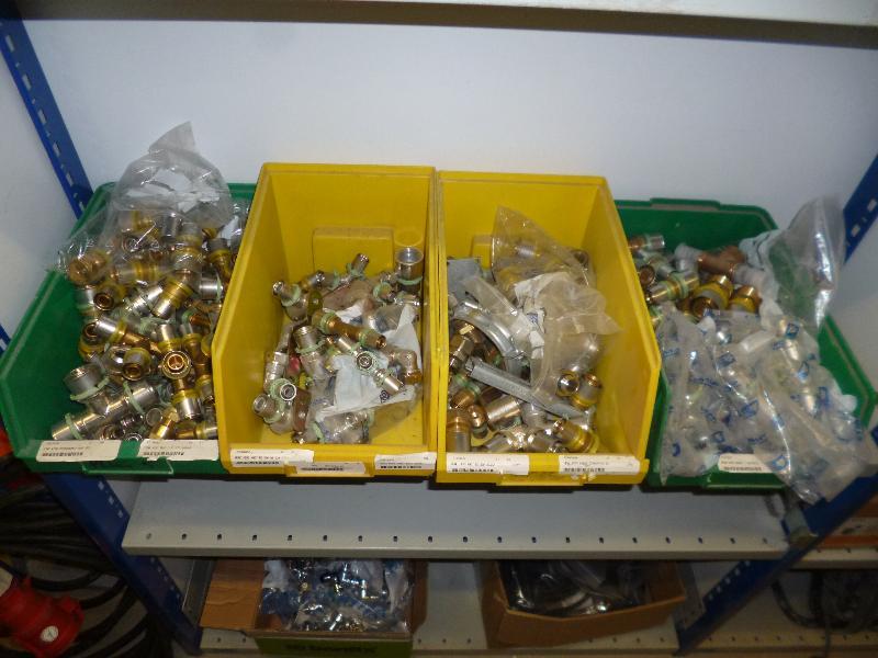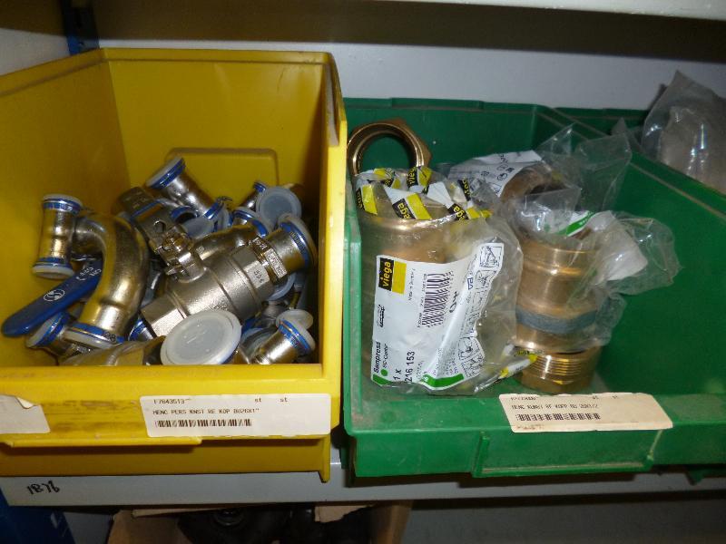 1 partij COMAP persfittingen/klemfittingen 16/26, ca. 75 verchroomde knieen 1/2 duims, Viega persfittingen 42/54, assortiment PE fittingen 25 mm.