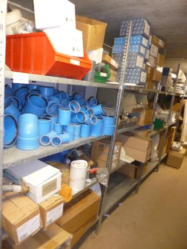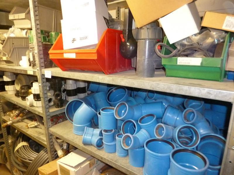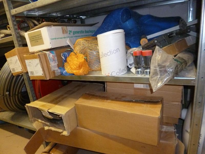 1 partij diverse rioolfittingen, Dyka Sono, 50/125, 2 rvs draingoten, 90, 1 douchegoot, 60, 1 douchebakondersteuning, hogedruk pvc, 2 kogelkranen, brandhaspel compleet met binnenwerk, 2 binnenwerken t.b.v. brandhaspel