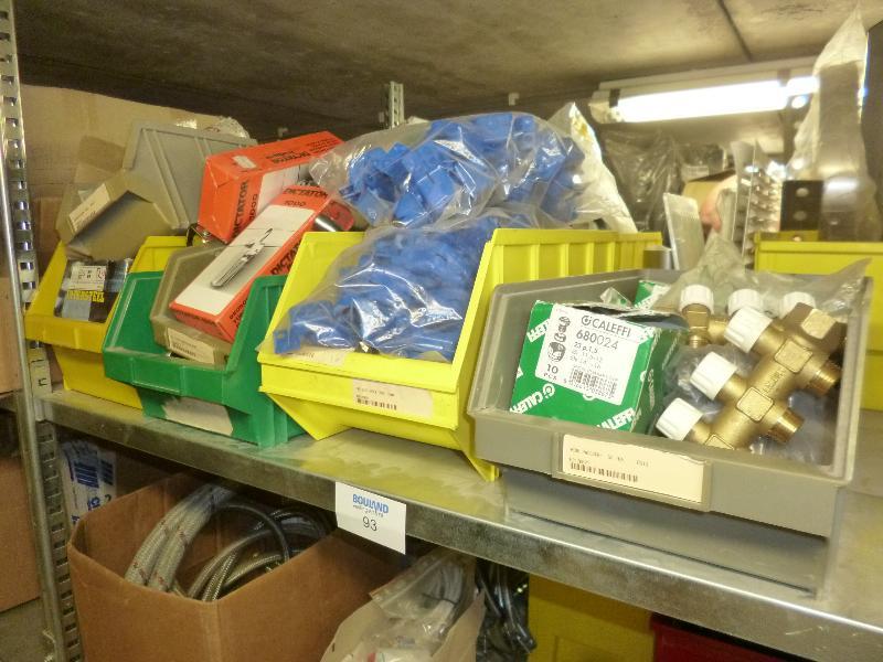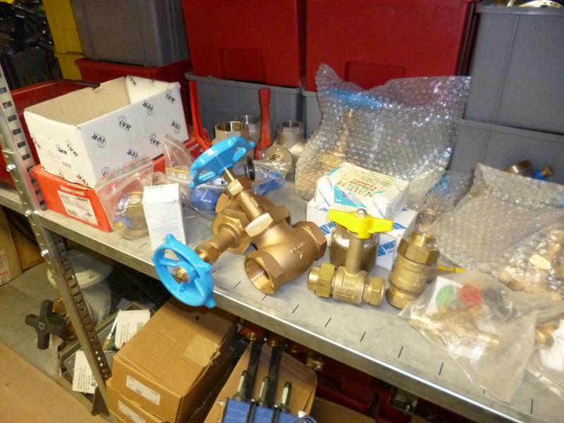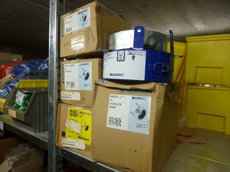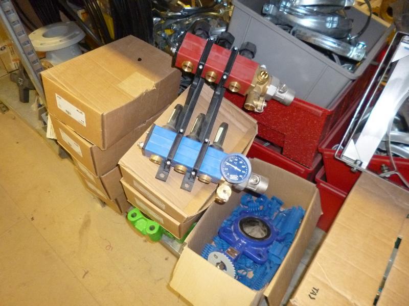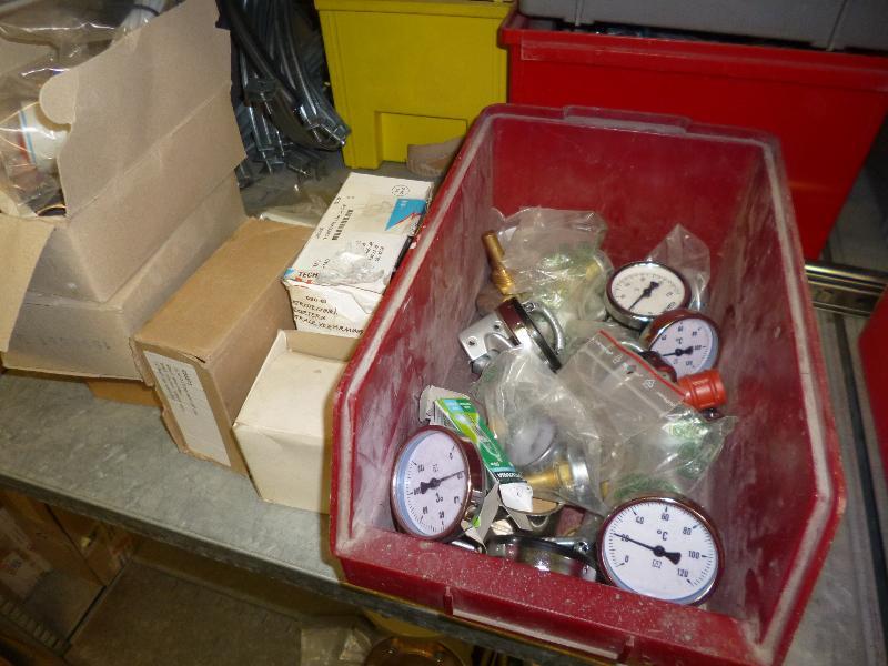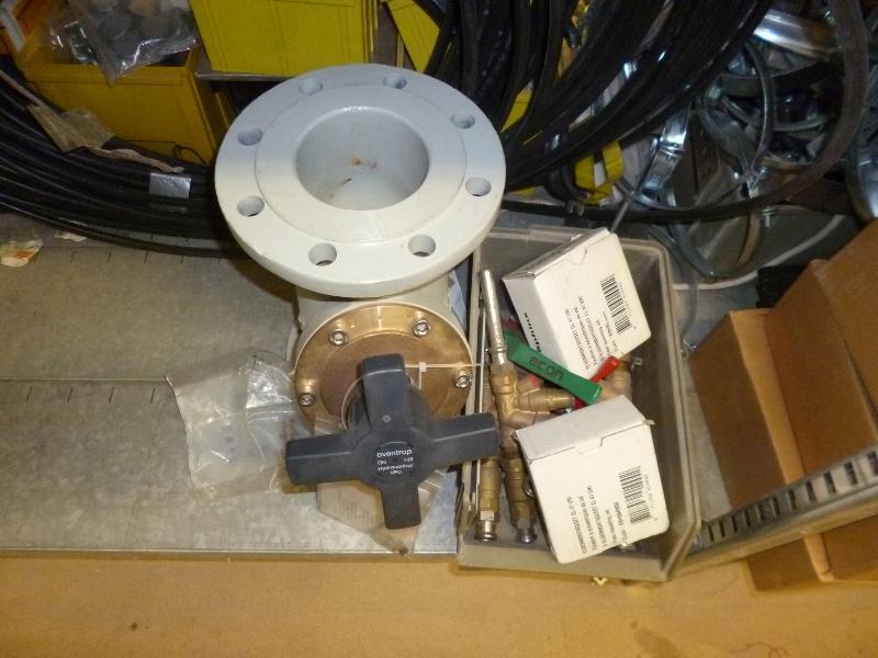 1 partij zegels watermeters, assortiment thermometers, Oventrop afsluiters, type DN 100, 1 Geberit brandmachette 125, 3 Geberit brandmachette 75, Caleffi verdelers/afsluiters 1/2 duims, diverse afsluiters, diverse afmetingen t.b.v. centrale verwarming, 1 Uponor verdeler