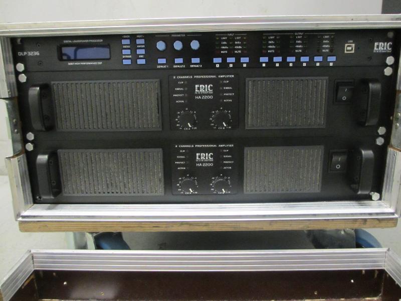 1 flightcase met 2 Eric Audio versterkers, type HA 2200 en 1 Eric Audio processor, type DLP 3236