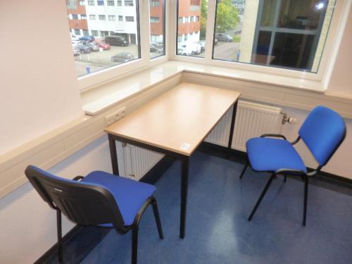 1 vergadertafel met 2 blauw gestoffeerde vergaderstoelen