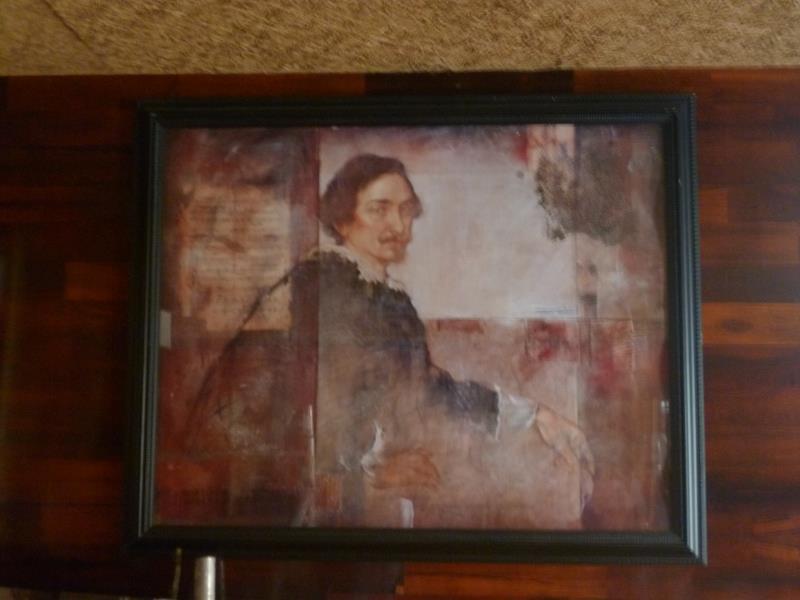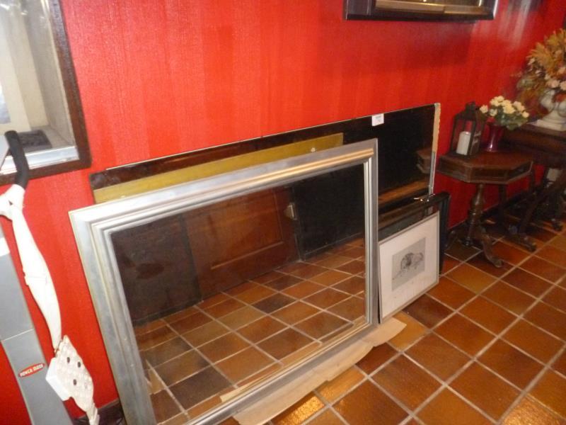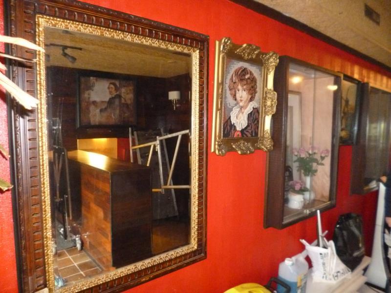 diverse spiegels en schilderijen aan de wand en op de grond, en dierse decoratiematerialen