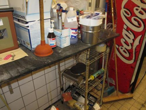 1 partij schoonmaakmiddelen, rvs rek en warmhoudplaat
