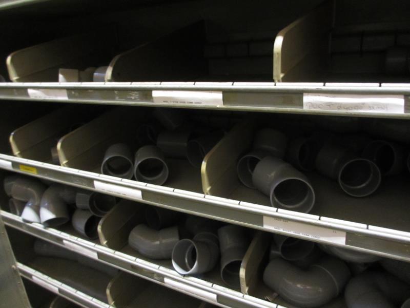 5 delen stelling met inhoud w.o. koperen/stalen/messing koppelingen, pvc materiaal etc.