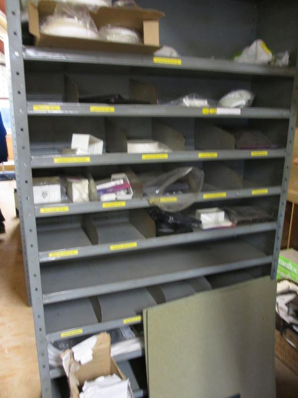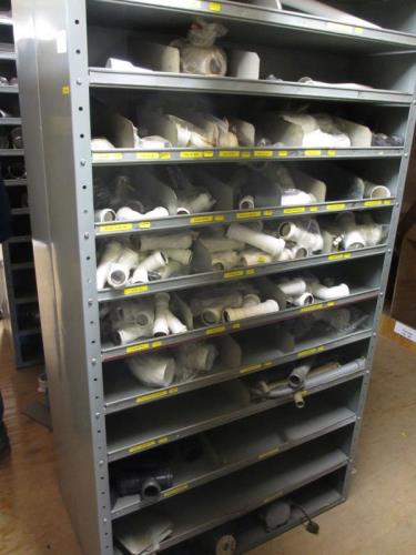 6 delen metalen stelling met inhoud w.o. afvoer, rookgasafvoer etc.