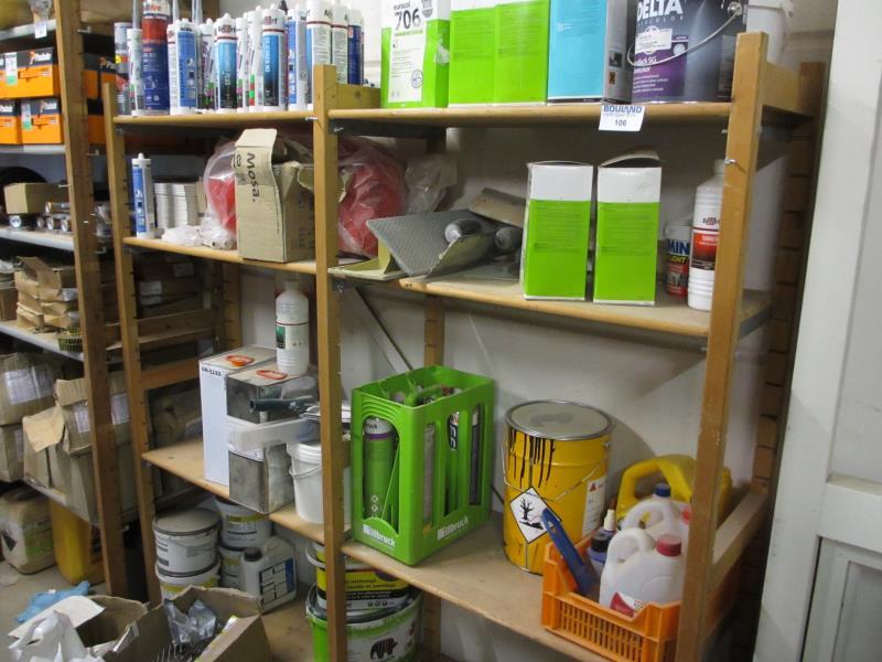 2 delen houten stelling met inhoud w.o. kitten, voegmiddel etc.