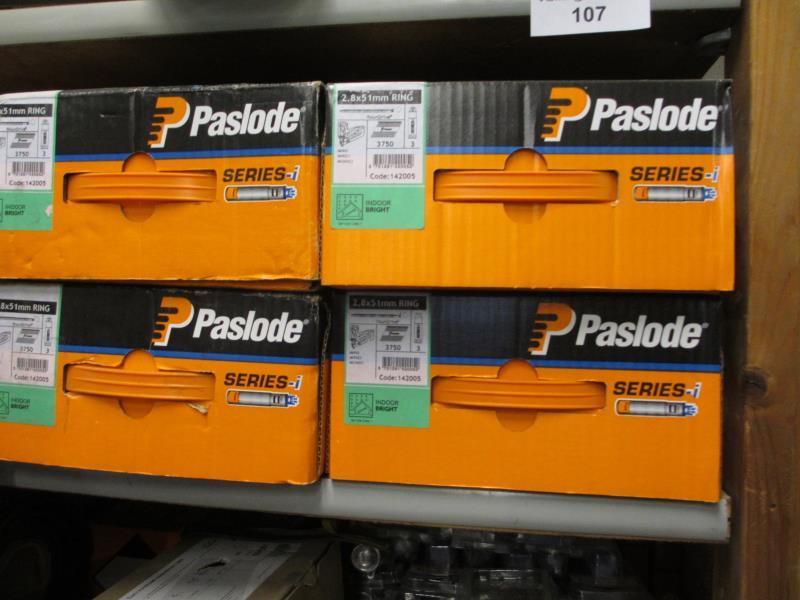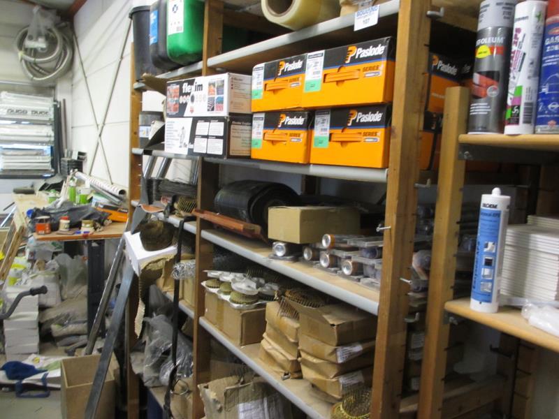 2 delen houten stelling met inhoud w.o. gaspatronen en spijkers t.b.v. tackers etc.