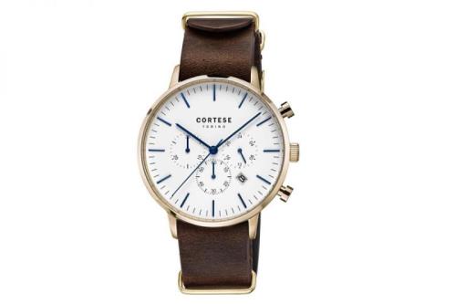 1 Cortese Dinastia C16004 Chronograph, Materiaal kast Edelstaal, Materiaal band Leer (NATO), Materiaal glas Gehard mineraal, Uurwerk Quatz (Miyota JS25), Datum unctie Ja, Chronograaffunctie Ja, 24-uursfunctie Ja, Diameter kast 42 mm, Dikte kast 9 mm, Bandbreedte 20 mm, Sluiting Gespsluiting, Waterdichtheid 5 ATM , adviesverkoopprijs € 249