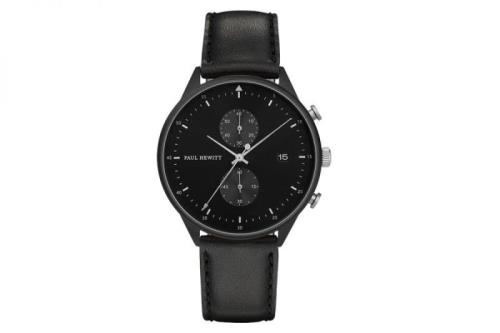 1 Paul Hewitt PH Watch Chrono Line Black IP Black/SS Leather Black 42mm PH-C-B-BSS-2M, Paul Hewitt herenhorloge met edelstalen kast met een diameter van 42mm en voorzien van lederen band. Japans quartz uurwerk met chronograaf en datumaanduiding, 5 ATM waterbestendig, adviesverkoopprijs € 179