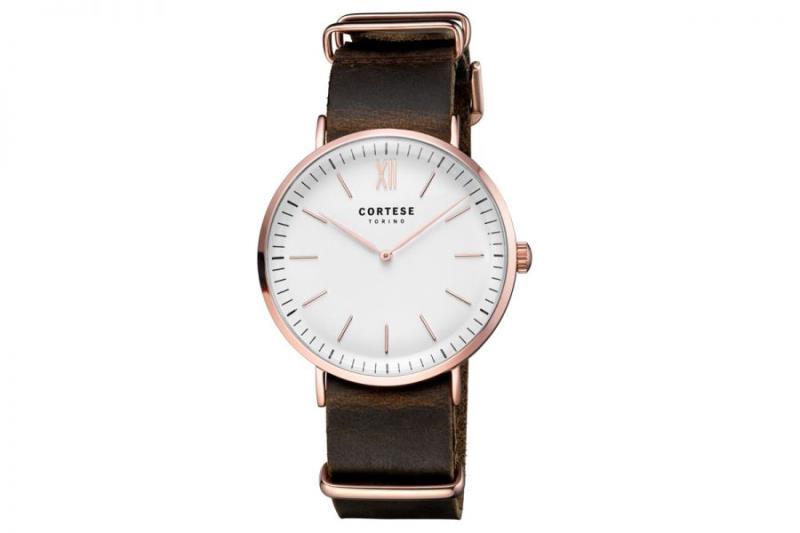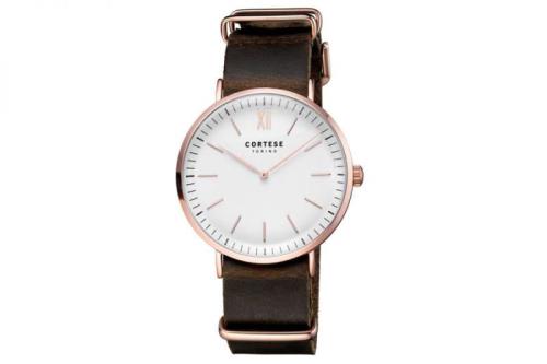 1 Cortese Prologo | C12805, Materiaal kast Metaal met roségoudkleurige IP coating, Materiaal band Leer (NATO) met vintage afwerking / oiled leather, Materiaal glas Gehard mineraal ('Domed' glas), Uurwerk Japans quartz (Miyota 2025), Wijzerplaat Curved dial, Diameter kast 40 mm, Dikte kas 9 mm, Bandbreedte 20 mm, Sluiting Doornsluiting, Waterdichtheid 3 ATM, adviesverkoopprijs € 149