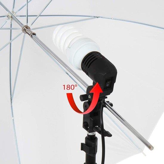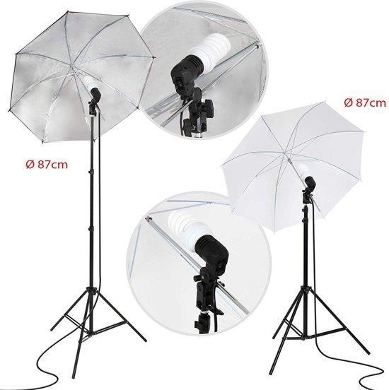 Aluminium fotostudioset lichten set – ca. 84 cm diameter incl. draagtas, lichtstativ: ca. 78 – 230 cm hoog,: E27 fitting – schirmstofffarben: zwart/zilver, wit, schaduw worden door de kappem zachte, Materiaal: aluminium.