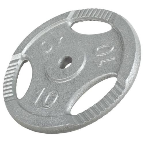 Advies verkoopprijs €  25,95 Kwaliteit Gietijzer (cast iron) Gebruik Voor professioneel gebruik, extreem hoge kwaliteit Gewicht 10 kg Bijzonderheid Met handige grijpopeningen (voorkomt blessures aan vingers) Kleur Grijs Afmetingen Doorsnede 34 cm, dikte 3,2 cm, geschikt voor 30/31 mm halterstang Gewichtsaanduiding Ja
