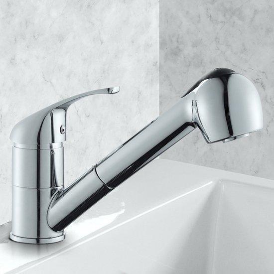 Productvoordelen op een rijtje: Precieze eenhandsmenging, keramische cartridgetechnologie, Verwijderbare, flexibele sproeikop, De vorm van de waterstraal verandert door op de knop op de sproeikop te drukken, Roestvrij slang om uit te trekken, Verchroomde massieve uitvoering, 2 slangen voor warm- en koudwateraansluiting (gestandaardiseerd en geïsoleerd), eenvoudige en snelle installatie, Technische specificaties: Afmetingen: Totale hoogte vanaf de basis: ca. 17 cm, Kraan: ca. 25,5 cm, Slanglengte: ca. 40 cm, Materiaal: kunststof en messing, Kleur: chroom, Omvang van de levering: 1 x keukenmengkraan, Montage- en aansluitmateriaal, 1 x meertalige installatiehandleiding