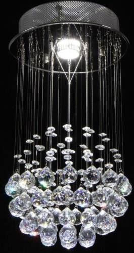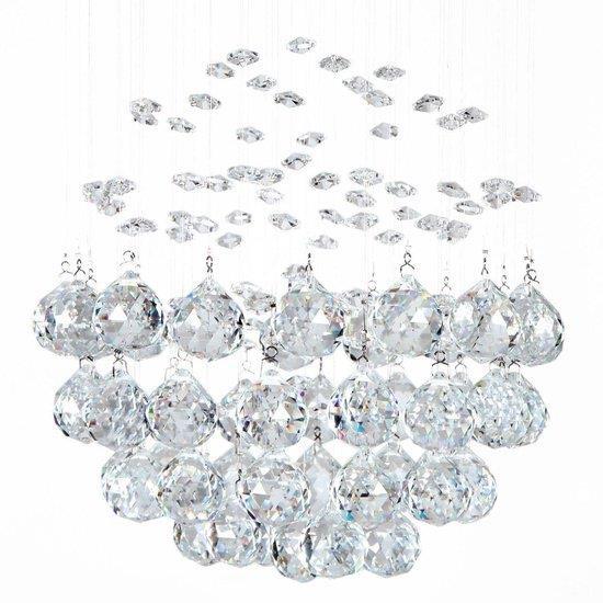 Prachtig design kroonluchter met een spektakel van kristallen. Tevens zijn de kristallen gemaakt van kleurloos glas. Specificaties: - 51 grote kristal bollen - 96 kleine kristal delen - Gemaakt van RVS - Hoogte: 50 cm - Diameter: 25 cm - 1 lamp aan te sluiten van max. 50 Watt (de lamp is niet bij de levering inbegrepen)