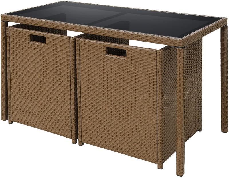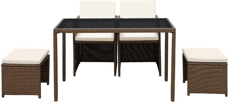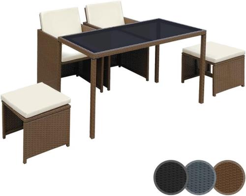 Met de gezellige zit- en rückenpolstern wordt u een hoogtepunt voor uw volgende tuin seizoen, maar ook ideaal voor uw terras of Wintertuin. De hoogwaardige en stabiele afwerking maakt u sterk en onderhoudsvriendelijk. De kruk kunnen bovendien zonder zitkussen perfect als bijzettafel gebruiken. Zo staat de ontspannen genussstunden met familie en vrienden niets meer in de wege. gezellige polyrattan zitgroep bestaande uit: 1 tafel, 2 stoelen en 2 kruk inclusief bijpassende zit- en rückenpolstern in crèmewit Frame van eisenrohr Slijtvast en onderhoudsarm Zwarte glastischplatte uit 5 mm dik veiligheidsglas Verkrijgbaar in grijs/in zwart/in bruin Technische gegevens: Afmetingen tafel (l/B/H): ca. 123/60/72 cm Afmetingen stoel (l/B/H): ca. 53/55/67 – 84 cm Afmetingen kruk (l/B/H): ca. 41/41/35 Afmetingen glastischplatte (l/B/H): ca. 118/54,5/0,5 cm Afmetingen zitkussen (l/B/H): ca. 41/41/5 cm Afmetingen rückenpolstern (l/B/H): ongeveer 46,5/40/5 cm Gewicht: ca. 38 kg Materiaal: kunststof, ijzer, glas Textile textielgrondstofsamenstelling kussen: 100% polyester Kleurkeuze wicker: grijs/zwart/bruin Kleur zitkussen: crèmewit Kleur tafelblad: zwart
