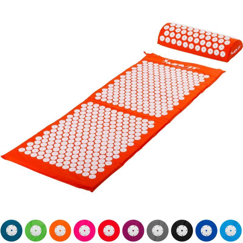EIGENSCHAPPEN: Afmetingen: 130x50x2.5 cm (mat) / 44x17x8.5 cm (kussen), hoezen: 100% katoen met acupressuurpads gemaakt van ABS-materiaal, vulling: schuimstof, gewicht: 1,2 kg, hoezen afzonderlijk wasbaar, kleur: oranje