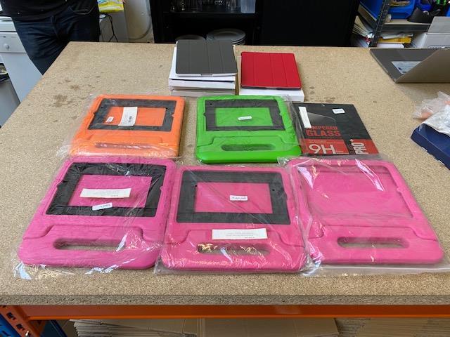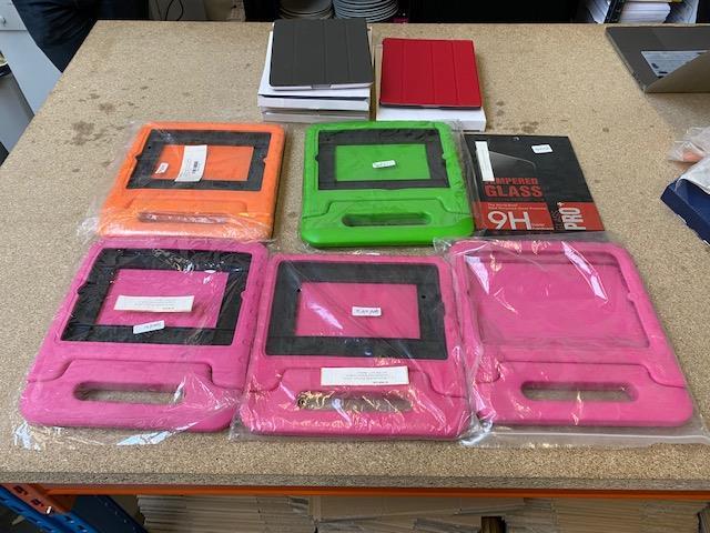 1 doos met ca. 225 smartphone hoesjes en screenprotectors, Iphone 4 ,5, 6 ,6 Plus en Samsung S 4, 5, 6, 7, 10 Ipad 2, 3, 4 hoezen en 1 Ipad screenprotector