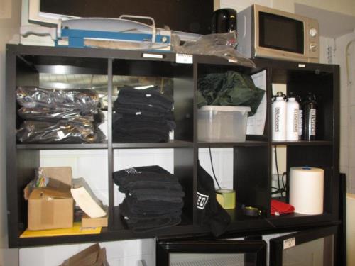1 vakkenkast met inhoud w.o. magnetron, waterkoker, papiersnij-appraat, bidons, handdoeken etc.