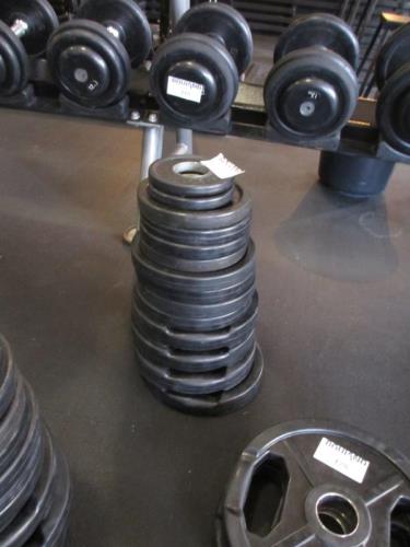 1 set schijven met 2 x 0,5 kg, 4 x 1,25 kg., 4 x 2,5 kg., en 4 x 5 kg.