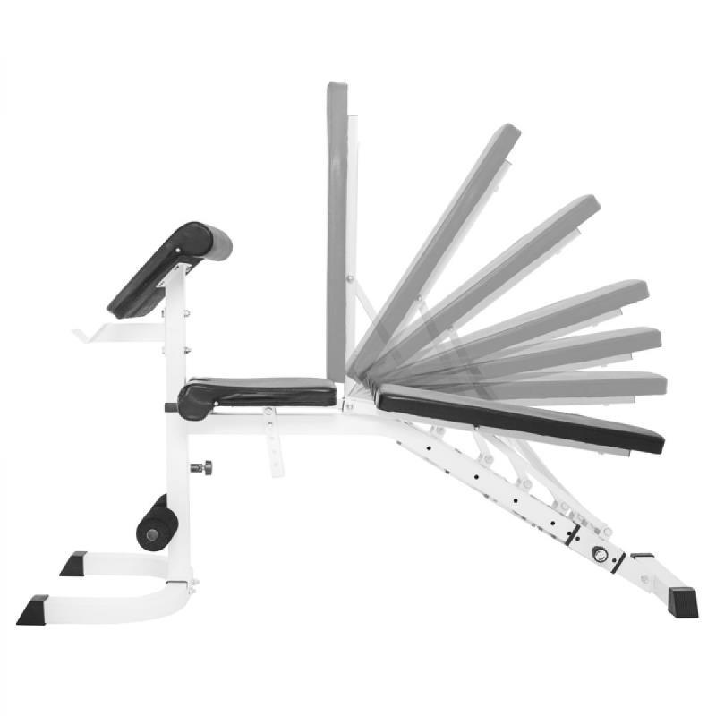 Deze halterbank is voorzien van een curlsteun en een losstaande haltersteun. De halterbank is verstelbaar in 7 standen en is geschikt voor incline, normaal en decline bankdrukken. De maximale belasting van losstaande de haltersteun is 100kg en de maximale belastig van de bank, inclusief gebruiker, is 280kg. De losstaande haltersteun is ook ideaal te gebruiken als squat rack.