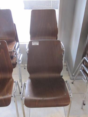 138 - 2 : 4 stapelstoelen, bruine houten zitting, metalen onderstel
