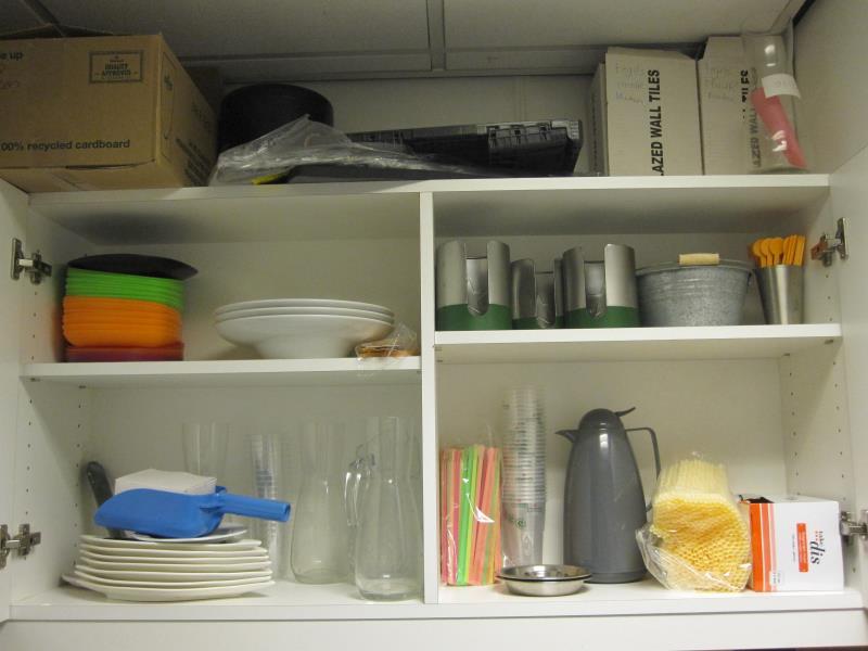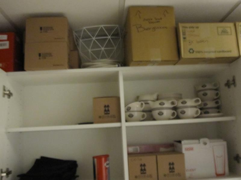 138 - 90 : 1 partij divers in en op de keukenkasten w.o. glazen, borden etc.