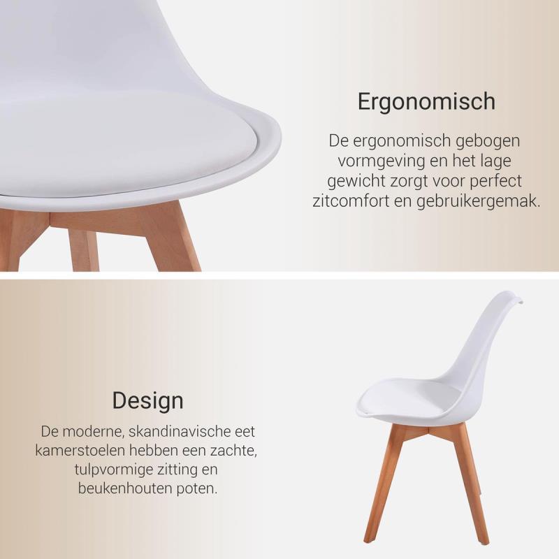 De moderne, skandinavische eetkamerstoelen hebben een zachte, tulpvormige zitting en beugenhouten poten. Ze zijn eenvoudig te monteren en kunnen worden gebruikt voor privé én commerciele doeleinden.
