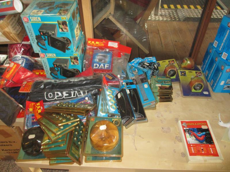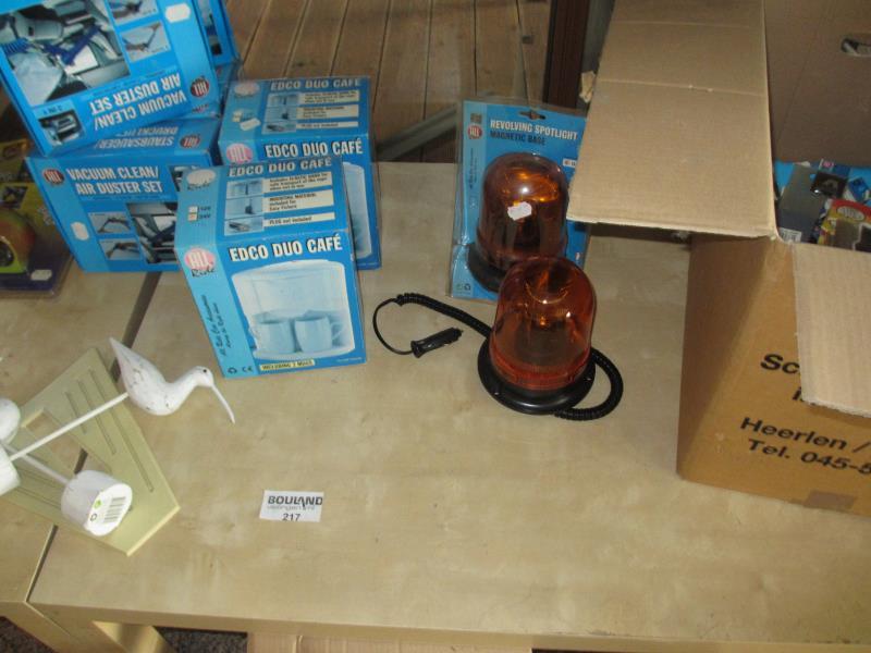1 partij truckaccessoires op 3 tafels w.o. koffiezetters, vaccum cleaners, zwaailichten, sirenes etc