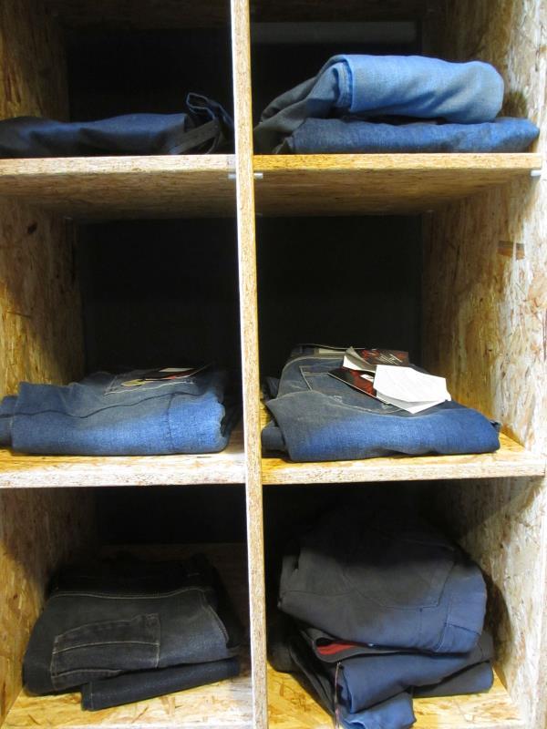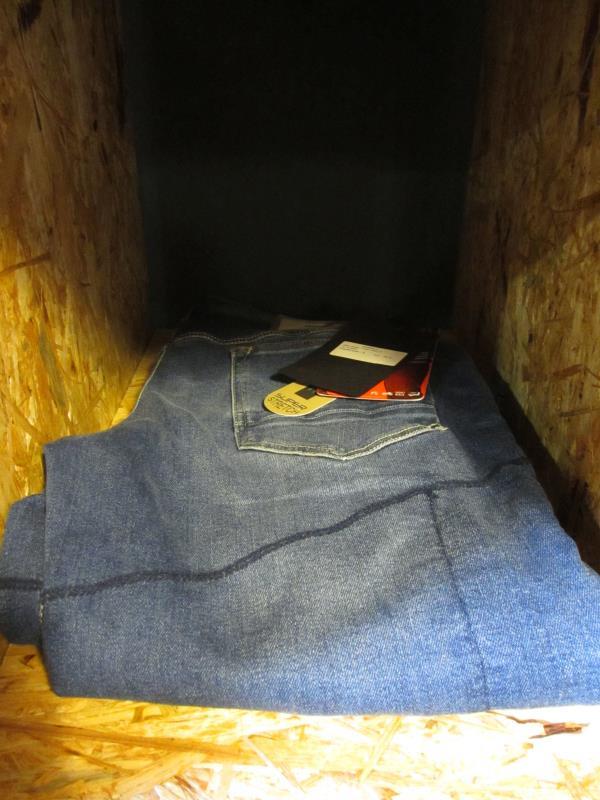 de inhoud van de kast w.o.motorjeans in diverse maten, diverse kleuren en diverse merken w.o. Blauer, Esquad etc.