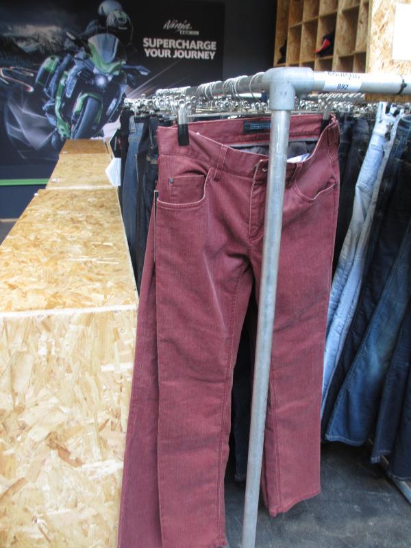 1 half kledingrek met motorjeans in diverse maten, kleuren en diverse merken w.o. Esquad, Richa etc.
