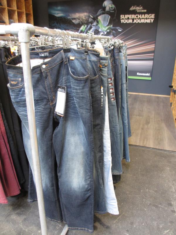 1 half kledingrek met motorjeans in diverse maten, kleuren en diverse merken w.o. Esquad, Richa etc.