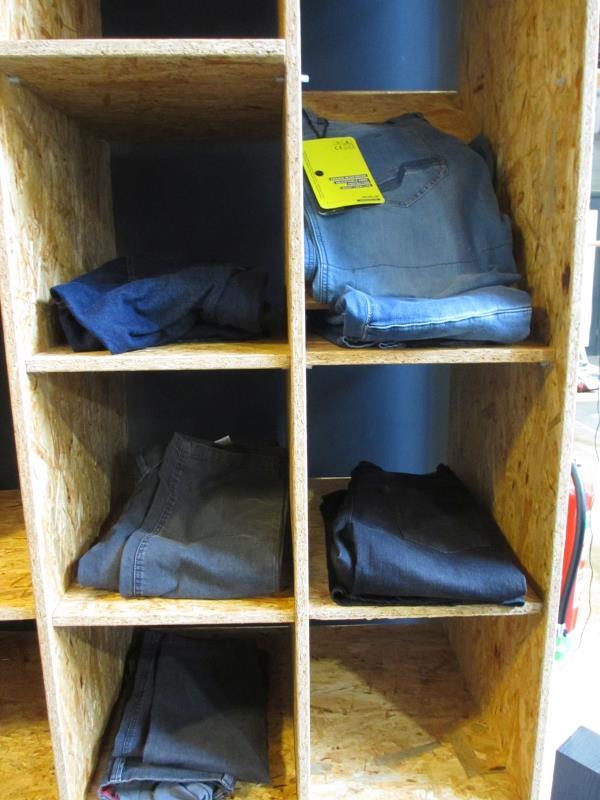 de inhoud van de kast w.o.motorjeans in diverse maten, diverse kleuren en diverse merken w.o. Grand Canyon, Macna etc.