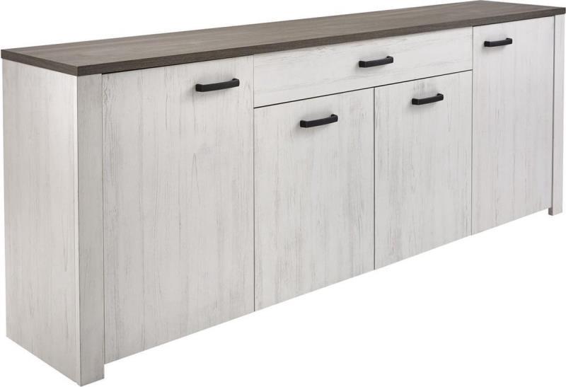 Dit is de Kesta - Marquis Dressoir4-deurs - Grijs/Bruin/Wit met de volgende eigenschappen: Schotel met 4 deuren. 1 lade in 15, 18 en 25 mm spaanplaat. Andersen pine decor, top in Prata eiken decor. 1 plank verstelbaar op 4 niveaus (afmetingen: 98x39 cm). 2 planken verstelbaar op 2 niveaus (afmetingen: 56x39 cm).Aged-effect, grijze kunststof handgrepen. Productspecificaties Materialen en afmetingen Afmetingen (hxbxd) 82,1 x 216 x 42,3 cm Submateriaal Melamine Type kast Dressoir