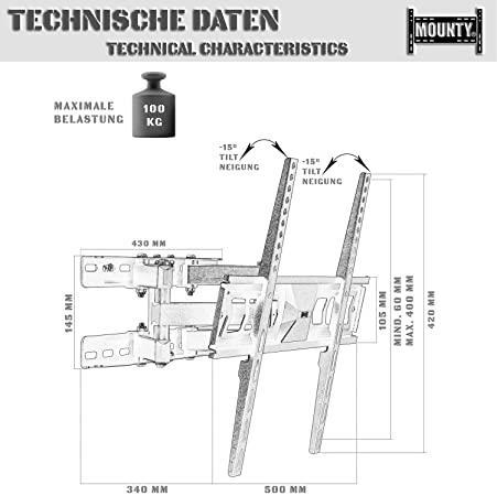 Onze universele compatibele tv-wandhouder van Mounty is geschikt voor de meeste 32-86 inch led's, LCD, plasma en flatscreen-tv's De tv-houder voldoet aan de volgende VESA-normen: 75x75 / 100x100 / 200x100 / 200x200 / 400x200 / 300x300 / 400x300 / 400x400 De twee zwenkarmen maken een afstand van 6 - 35 cm tot de muur mogelijk, dankzij de uitschuifbare armen kan de tv traploos tot 90 graden worden gedraaid Voor de optimale kijkhoek kan onze houder tot -15° worden gekanteld Deze tv-wandhouder is ook geschikt voor grotere apparaten, omdat de houder is gemaakt van 2 mm koud gewalst staal en een maximale belasting van 100 kg biedt
