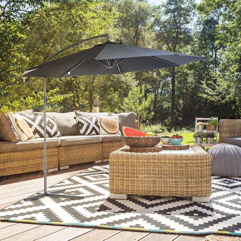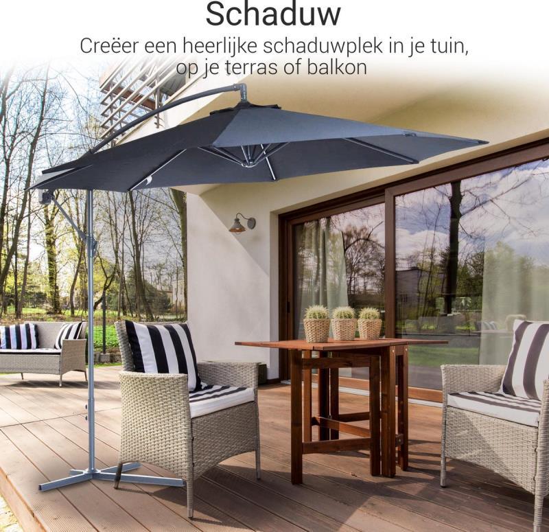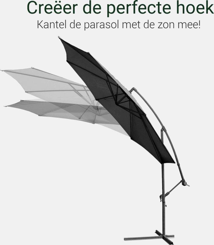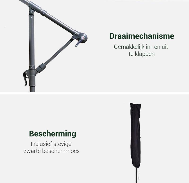 Het handige van deze zweefparasol is dat hij 180 graden te draaien en 60 graden te kantelen is. Hierdoor kan je op elk moment van de dag de perfecte hoek creëren tegen de zon!