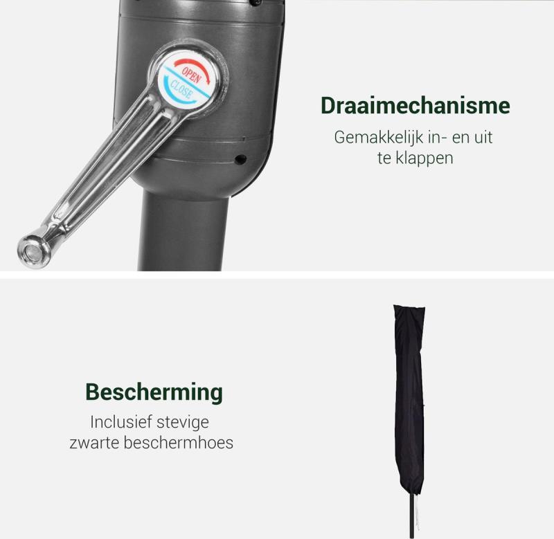 Om je parasol zo lang mogelijk mooi te houden leveren wij een gratis zwarte beschermhoes mee. Zwart is uiteraard de minst besmettelijke kleur dus evt vlekken zal je ook niet snel op de beschermhoes zien. De beschermhoes schuif met alle gemak netjes over de parasol om hem vervolgens met het koord dicht te trekken. Kind kan de was doen!
