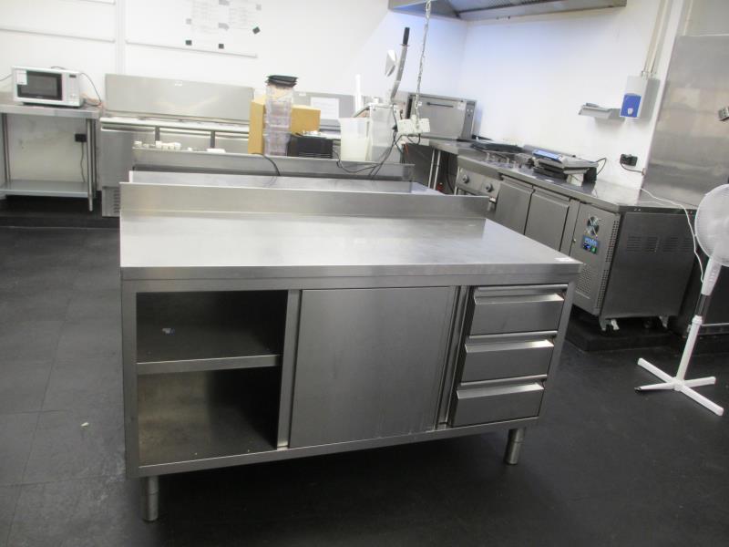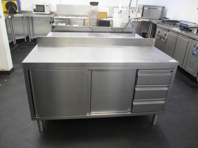 1 rvs werkbank met ondergebouwde kast en 3 lades, afm. ca. 150 x 60 cm.