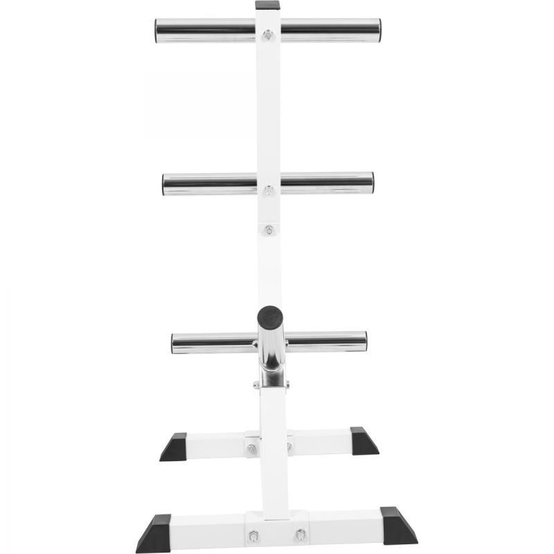 Iedereen die thuis traint heeft er mee te maken: het instellen van je halters op het gewenste gewicht. Na iedere oefening en soms zelfs na elk setje, moeten er wat schijven af en wat schijven bij. Halterschijven liggen her en der verspreid over de vloer van je kamer, zolder, kelder of waar je ook traint. Niet ideaal: want afgezien van de troep, pauzeer je zo onnodig lang en dat komt je fitness level niet ten goede. Daarom hebben we een oerdegelijke schijvenstandaard in de aanbieding - van zware sportschoolkwaliteit - in chique witte uitvoering.