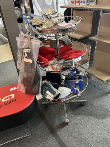 1 verrijdbare etagestelling met inhoud w.o. bandana's, shawls, niergordels etc.