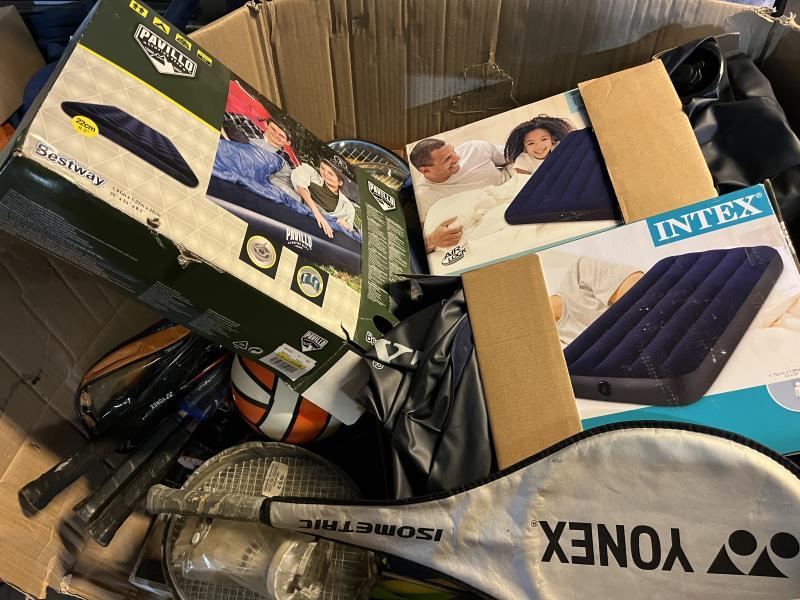 1 doos met inhoud w.o. squashrackets, luchtbedden etc.