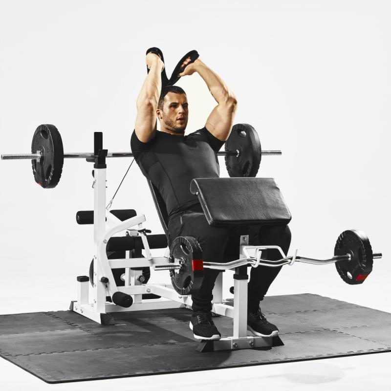 Deze multifunctionele halterbank is voorzien van een curlrack, dipsteunen en kabels, daardoor kun je je borstspieren, schouders, biceps, triceps, rug -en buikspieren trainen. De bank, rugleuning en curlrack zijn verstelbaar. De haltersteunen zijn belastbaar tot 180 kg en de bank tot 280.