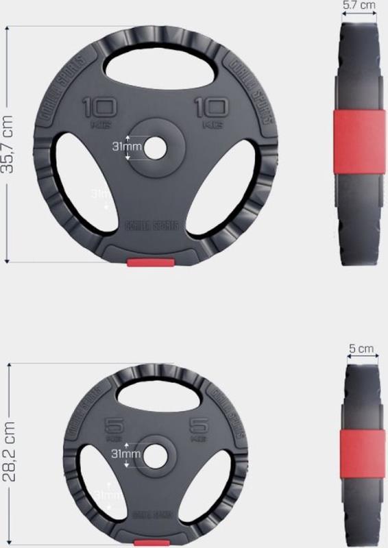 2 schijven van 5 kg, ø 28,2 cm | Hoogte 27 cm | Dikte 5cm