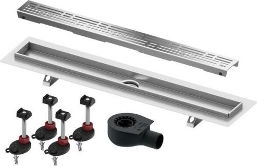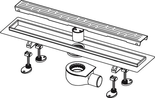 TECEdrainline douchegotenset Douchegotenset bestaande uit een rechte douchegoot, een designrooster "basic", een afvoer "minimaal" en vier stelpootjes.