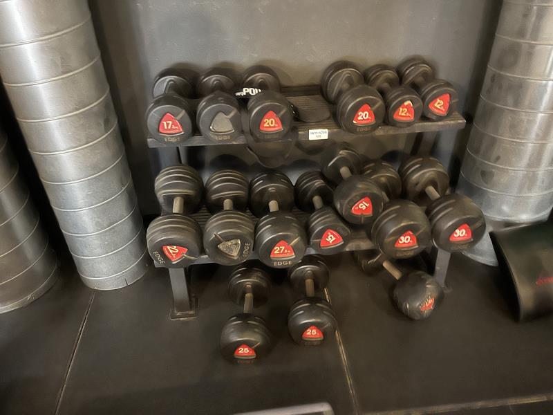 1 dumbellrek met 15 diverse dumbells (12 t/m 25 kg)