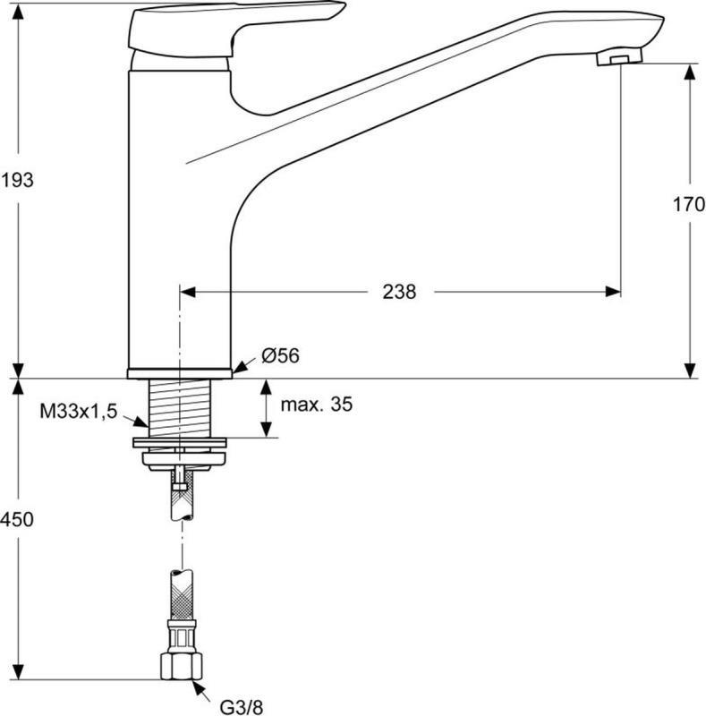 Ideal Standard CeraMix Blue keukenmengkraan, voorsprong uitloop 238mm, volumestroomklasse B (11.5-14.4 l/min.), blad/kraangat, 1-gats kraangaten, bedieningswijze hand, aantal grepen eengreeps, incl. grepen, type kraanknop hendel, temperatuurbegrenzing, uitvoering uitloop draaibaar onder,