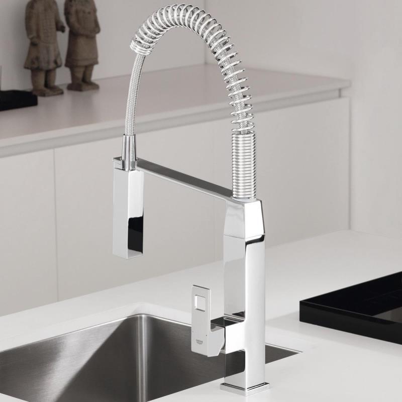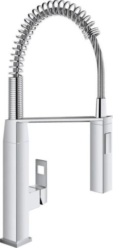 Winkelverkoopprijs € 675 Hoekig gestyled design voor de moderne en innovatieve keuken en met een uitstraling die ook in de professionele keuken niet zou misstaan. Precies dat belichaamt de GROHE Eurocube Professional. Bij deze kraan valt met name de veerophanging van de handdouche op. 360° draaibaar en voorzien van een knop waarmee je handig en snel wisselt tussen de fijne spoelstraal en de krachtige douchestraal. Ideaal voor het vullen van grote pannen en het omspoelen van de afwas- en schoonspoelen van de groente en de spoelbak. De kraan is voorzien van GROHE SilkMove® zodat het regelen van watervolume en -temperatuur altijd vloeiend verloopt. De robuuste chromen GROHE StarLight® beschermlaag is onderhoudsvriendelijk en glanst ook na jaren van gebruik nog als op de eerste dag. De kraan laat zich eenvoudig monteren dankzij het snelmontagesysteem. Daarvoor hoef je zeker geen professional te zijn. Voordelen: 360°: grote actieradius door de hoge uitloop in combinatie met de gebogen spiraal – de professionele handdouche van GROHE De professionele uitloop kun je uittrekken, buigen, 360° draaien en met één hand bedienen. Voor optimaal vullen, afspoelen en reinigen. Alles gaat even makkelijk en efficiënt deze professionele GROHE mengkraan. Door zijn flexibiliteit wordt je werkveld vergroot en met een druk op de knop wissel je bovendien snel tussen de gewone straal naar de krachtige douchestraal. Gemak dient de mens. Zeker in de keuken. Hoge uitloop: handig tijdens het koken Gemakkelijk grote pannen afspoelen: dankzij de hoge uitloop kun je met deze GROHE kraan ook de moeilijkste klussen in de keuken simpel uitvoeren. Bij GROHE vind je altijd een product dat voldoet aan jouw wensen: wij hebben voor elke klus de beste en meest comfortabele oplossing. Draaihoek van 360° voor het moeiteloos draaien in alle richtingen Volledige flexibiliteit: de uitloop kan in een straal van 360° worden gedraaid: je kunt er alle kanten mee op! Vooral handig om tussen twee spoelbakken te wisselen. GROHE StarLight® – altijd een glanzende kraan Veeg de kraan eenvoudig met een droog doekje schoon. Het super gladde oppervlak is krasbestendig, laat zich makkelijk schoon maken en heeft een mooie glans. Je bent dus minder tijd kwijt aan schoonmaken, terwijl je kraan er altijd als nieuw uitziet. GROHE SilkMove®: een kraan met stuurbekrachtiging Je kunt de temperatuur en het volume van deze kraan in één beweging instellen: dankzij het hoogwaardige binnenwerk van de kraan is de hendel licht te bedienen – ook na jaren intensief gebruik. SpeedClean houdt je keukenkraan kalkvrij Uitloop, professionele kraan, aparte- of uitrekbare handouche of mousseur: het SpeedClean anti-kalk system voorkomt kalkvorming. Allen zijn voorzien van flexibele siliconen lamellen die je met een beweging van je vinger schoon veegt. Poetsen is nooit meer nodig. Snelmontagesysteem: ook voor klussers met twee linkerhanden Deze kraan installeer je in een handomdraai. Het snelmontagesysteem bestaat uit slechts een paar onderdelen en is kinderlijk eenvoudig. Met behulp van de flexibele aansluitslangen en de overzichtelijke handleiding kun je je nieuwe kraan zonder problemen zelf aansluiten.
