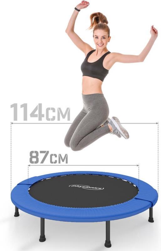 Deze fitnesstrampoline is verkrijgbaar in de volgende variaties: 81, 91, 96, 102, 114, 122 cm diameter en wordt geleverd met antislipvoetjes die stabiliteit beloven