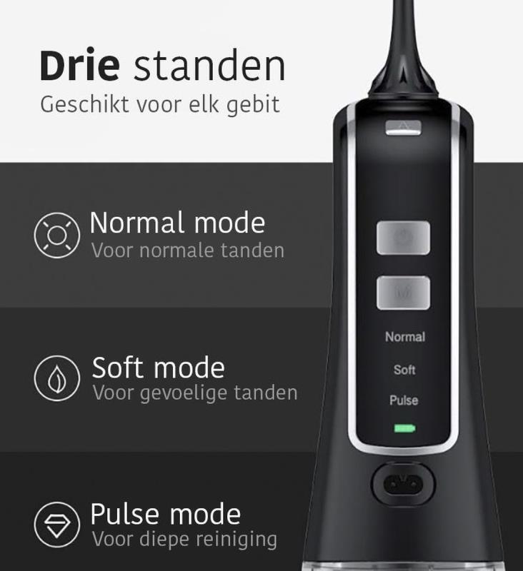 De draadloze waterflosser van Nicefeel heeft 3 poetsstanden. De zachte stand wordt aanbevolen voor nieuwe gebruikers, zodat het tandvlees langzaam kan wennen. De massagestand pulseert, waardoor de tanden extra grondig worden gereinigd.